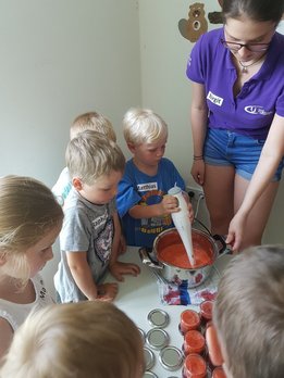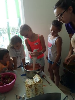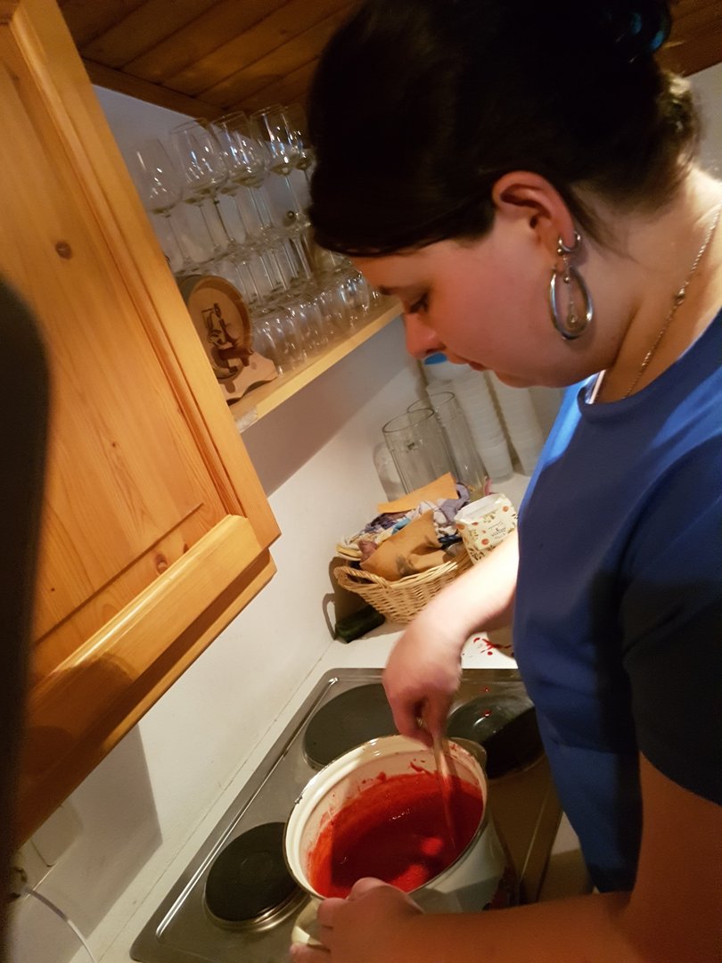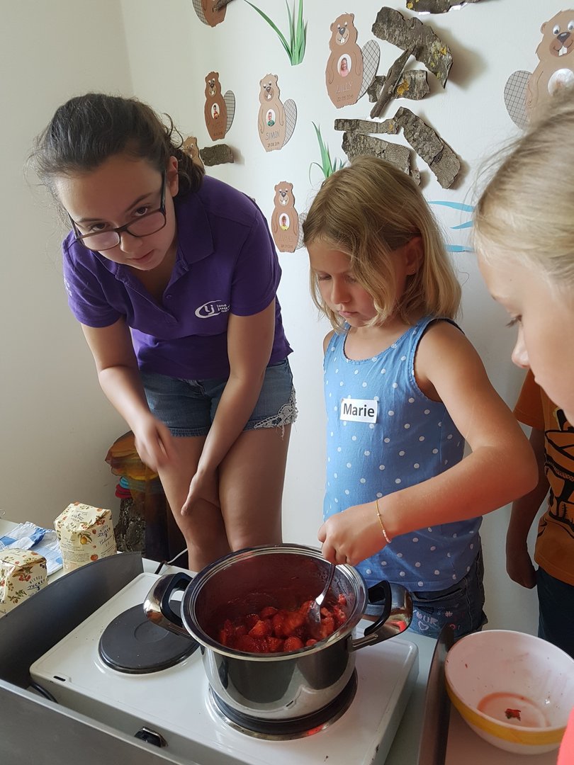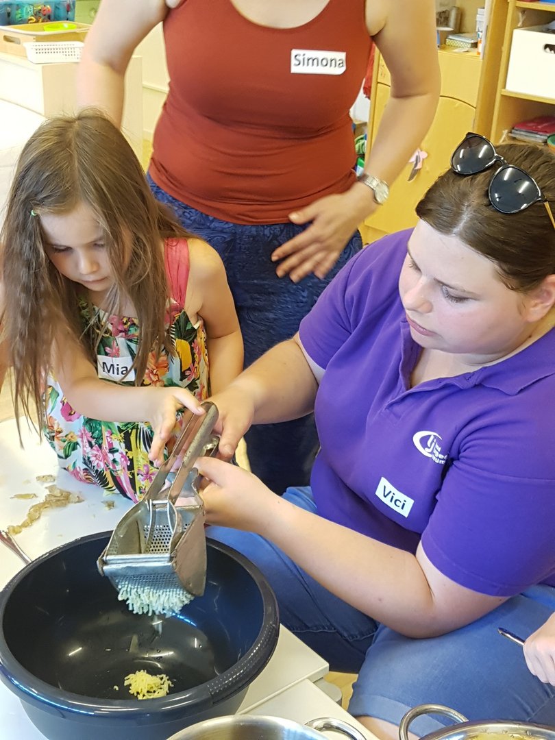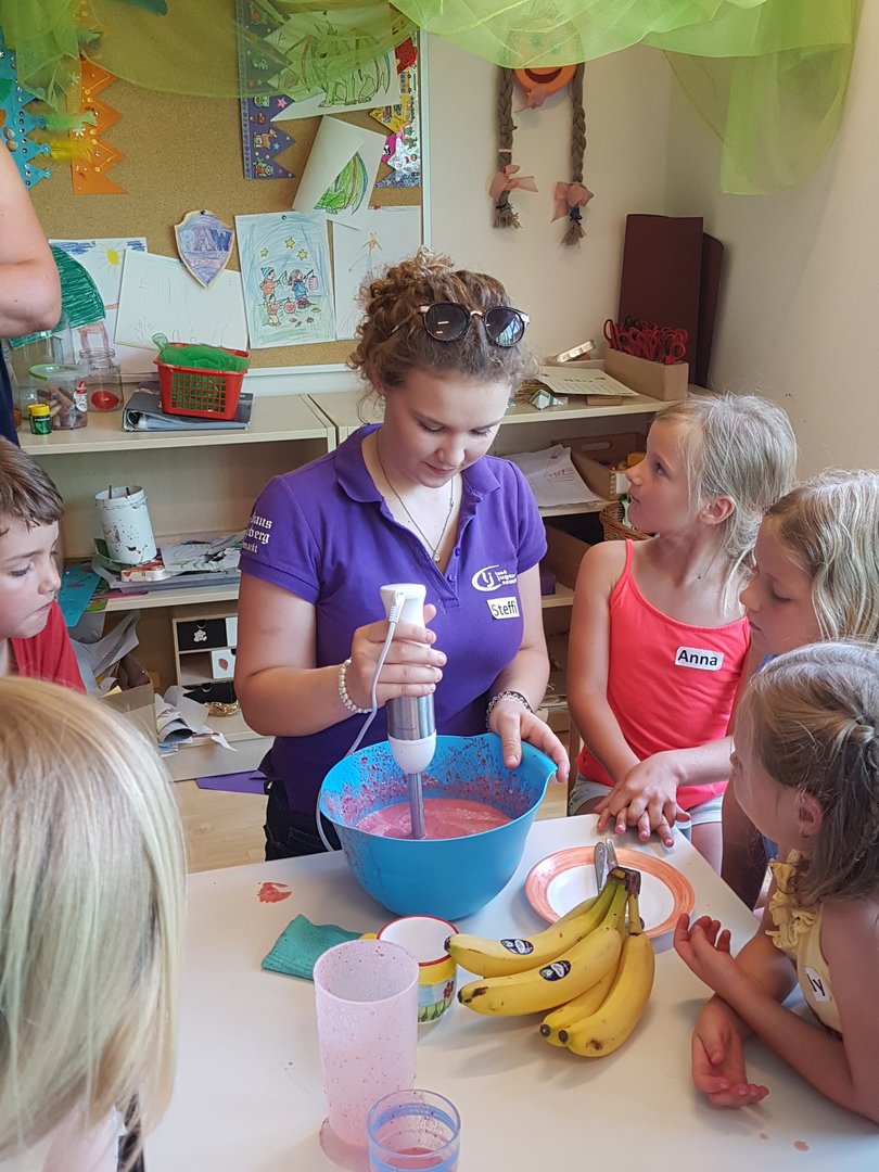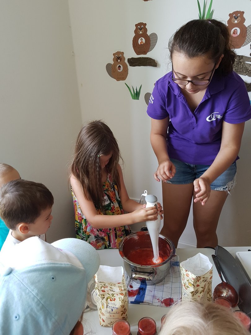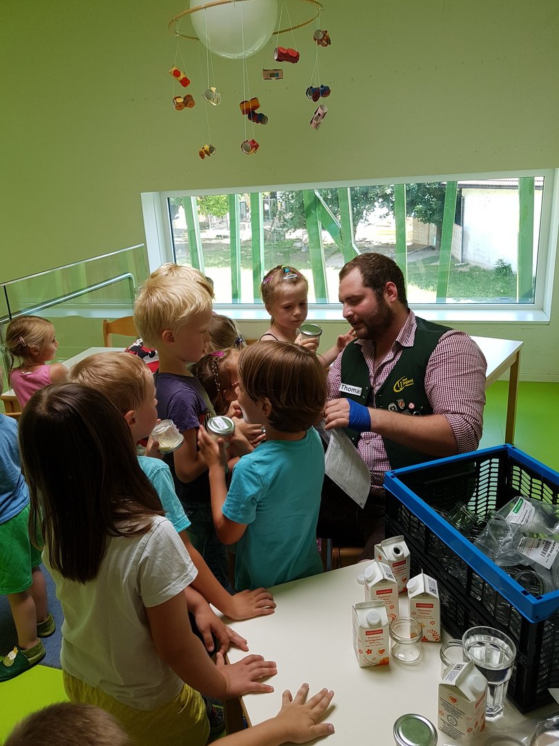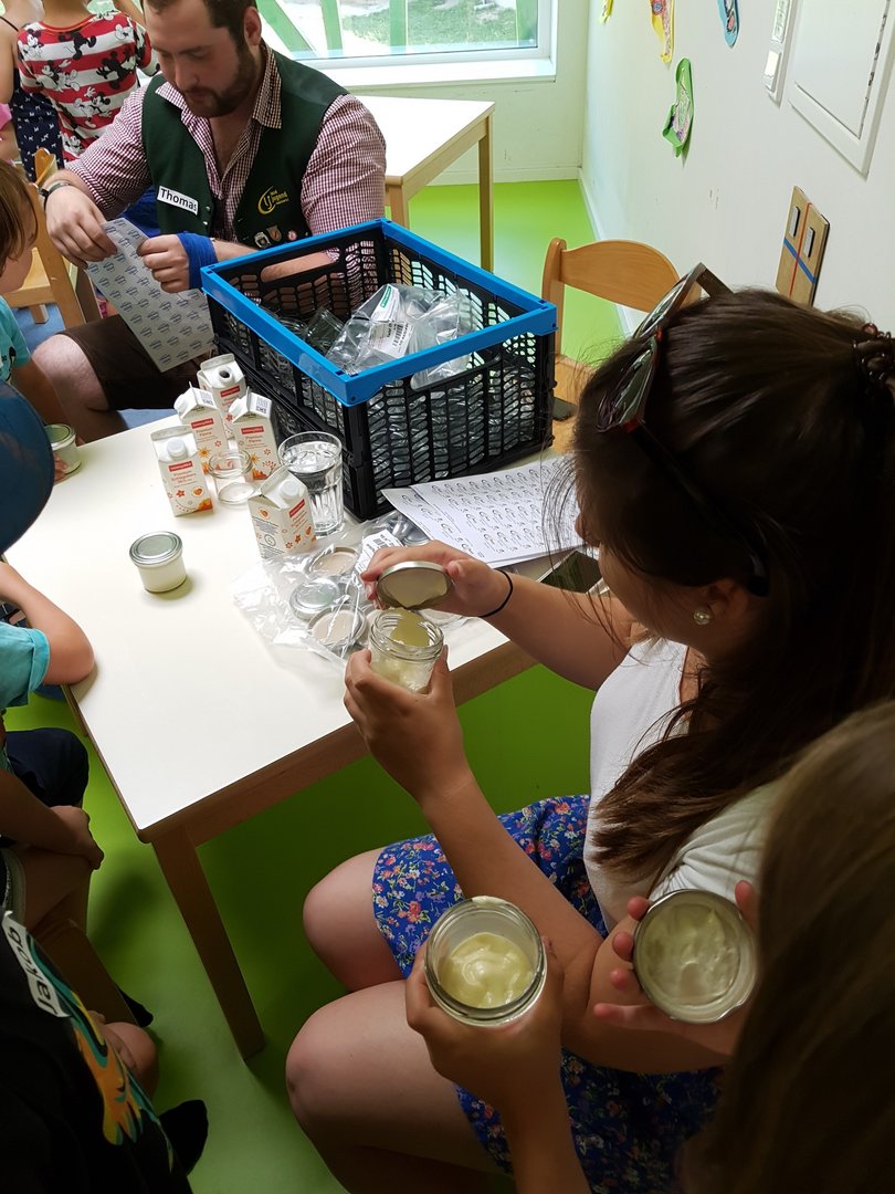 Gemeinsam haben wir mit den Kids Marmelade gemacht, Brot gebacken, Butter geschüttelt und Milchshakes zubereitet. Im Anschluss durften die Kinder noch einen Traktor begutachten und sogar in den Anhänger für die Heuernte klettern und sich anschauen mit welchen Geräten ein Landwirt das Futter für die Tiere erntet.