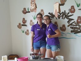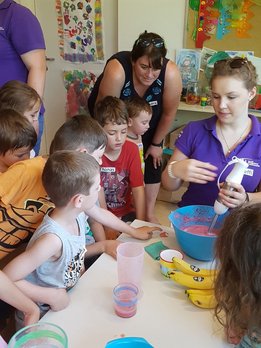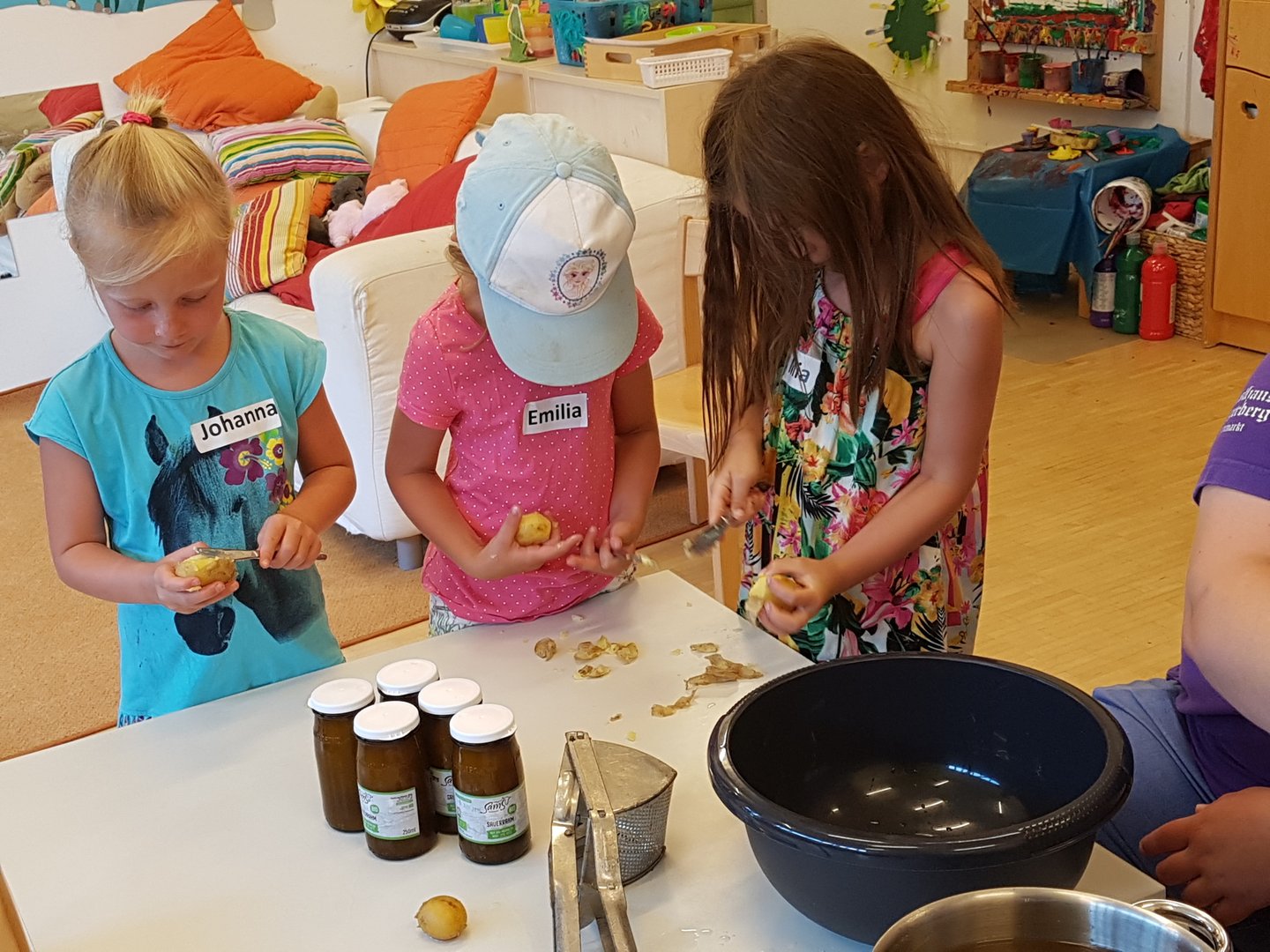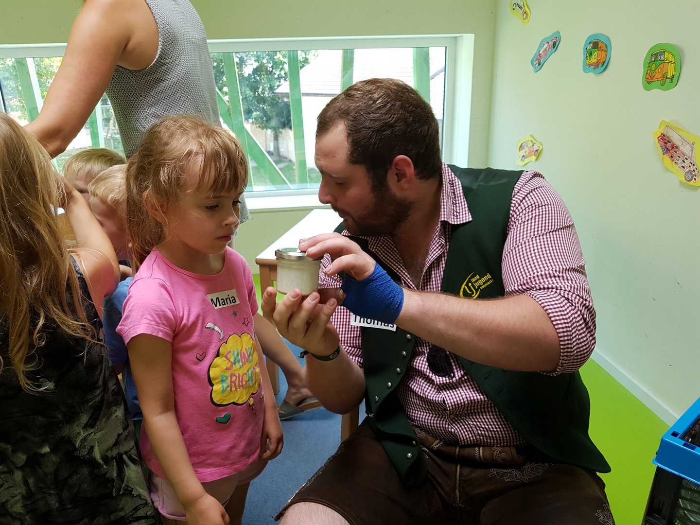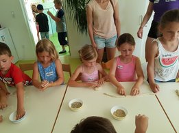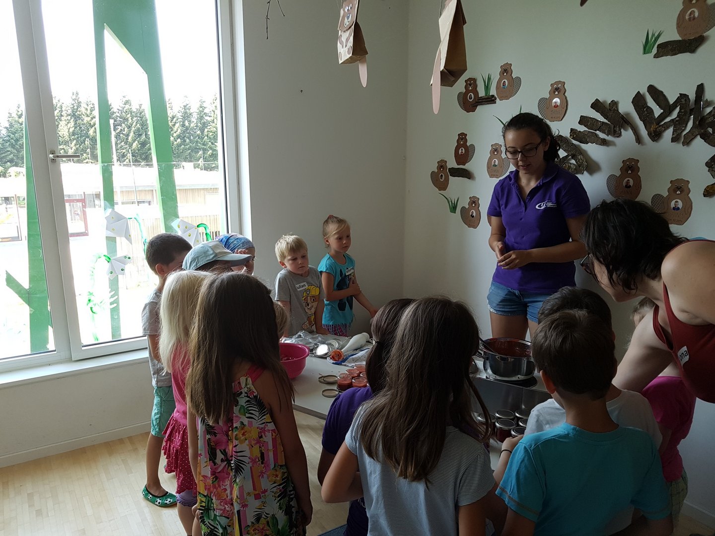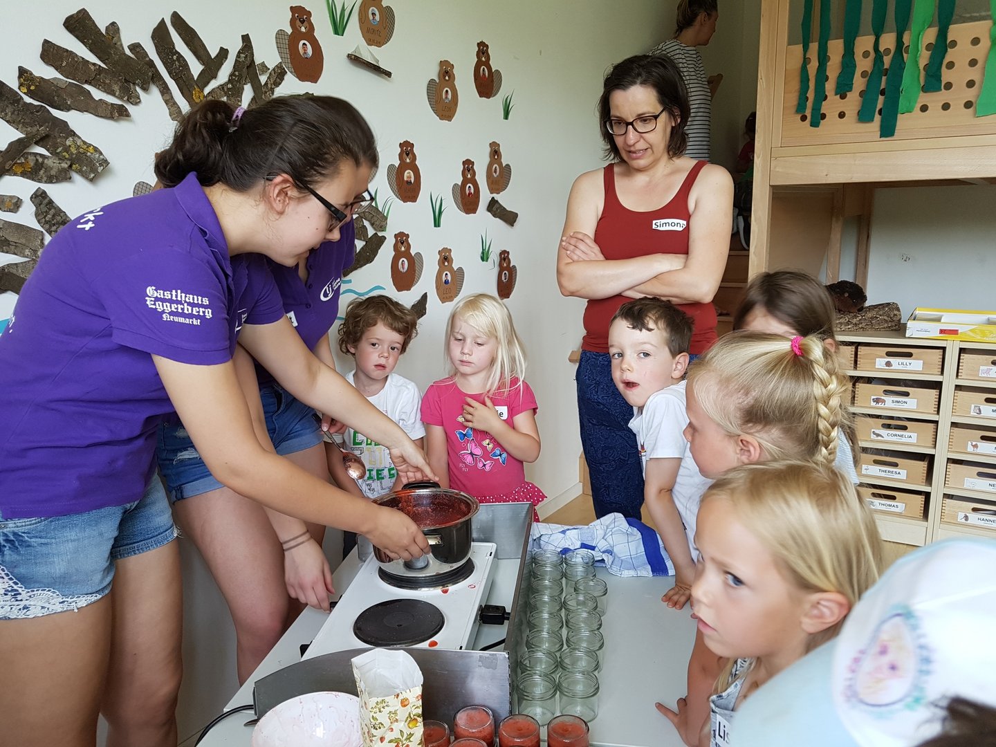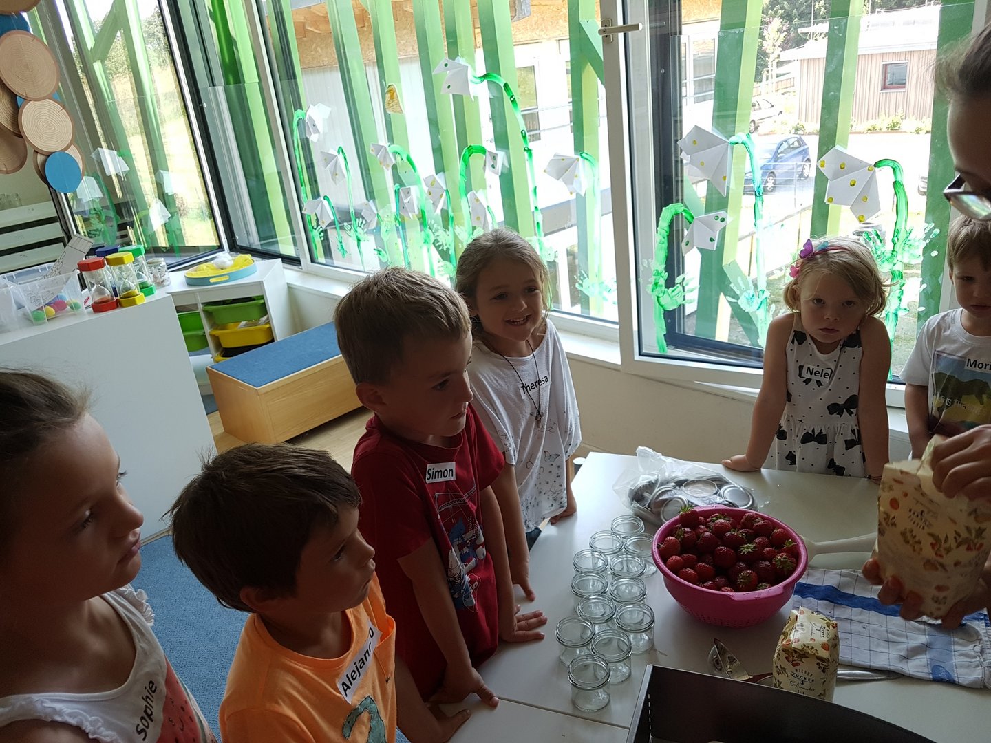 Gemeinsam haben wir mit den Kids Marmelade gemacht, Brot gebacken, Butter geschüttelt und Milchshakes zubereitet. Im Anschluss durften die Kinder noch einen Traktor begutachten und sogar in den Anhänger für die Heuernte klettern und sich anschauen mit welchen Geräten ein Landwirt das Futter für die Tiere erntet.