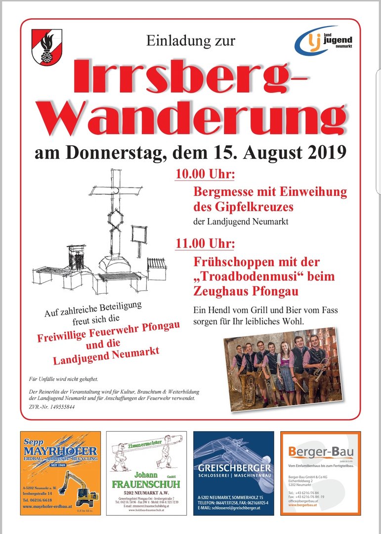 Es ist nicht mehr lange bis zur Einweihung des neuen Landjugendplatzes am Irrsberg. Wir haben in den vergangenen Wochen und Monaten einiges an Arbeit geleistet und freuen uns, wenn wir gemeinsam mit euch am 15. August 2019 den neu gestalteten Gipfelplatz feierlich einweihen dürfen. Die Einweihungsfeier findet im Rahmen der Bergmesse bei der traditionellen Irrsbergwanderung der Feuerwehr Pfongau statt. Im Anschluss ist wie jedes Jahr der traditionelle Frühschoppen bei der Zeugstätte der Feuerwehr Pfongau. Dieses Jahr gestalten wir diesen jedoch zusammen. Auf Euch wartet:
